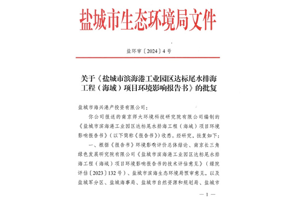 鹽城市濱海港工業(yè)園區(qū)達標尾水排海工程(海域)項目取得環(huán)評批復