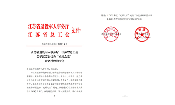 近日,江蘇省退役軍人事務廳、江蘇省總工會聯(lián)合發(fā)布了《關于優(yōu)秀“戎耀之家”命名授牌的決定》,鹽城市灌東鹽場發(fā)展有限公司被授予“2023年度江蘇省優(yōu)秀‘戎耀之家’”。2024-01-02